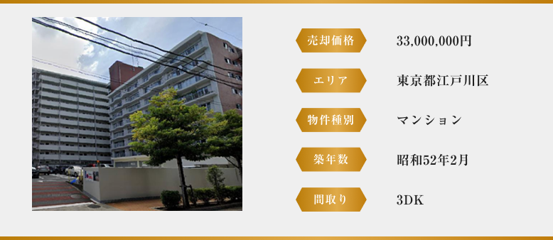 東京都江戸川区では、昭和52年築のマンションを3,300万円で売却し、老朽化物件の再流通にも対応。また、香川県高松市では平成3年築・3LDKのマンション一棟を1億2,800万円で成約するなど、地方主要都市でも安定した取引実績を残しています。